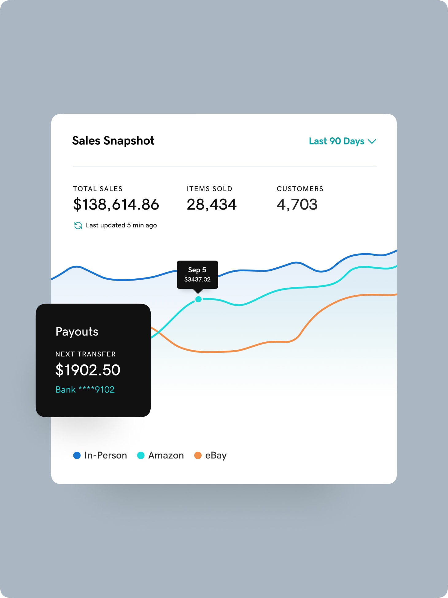 Sell to millions in your ecommerce store, in-person, and on leading marketplaces like eBay, Amazon, and beyond.
