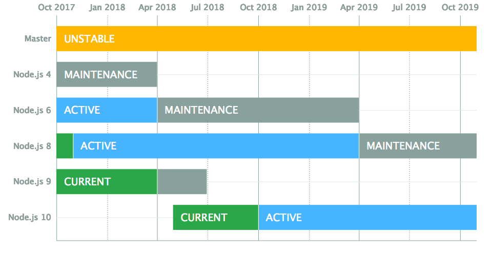 This LTS goal is a core reason why this release took three years to ship. Let’s look at a recent release chart for Node.js LTS: