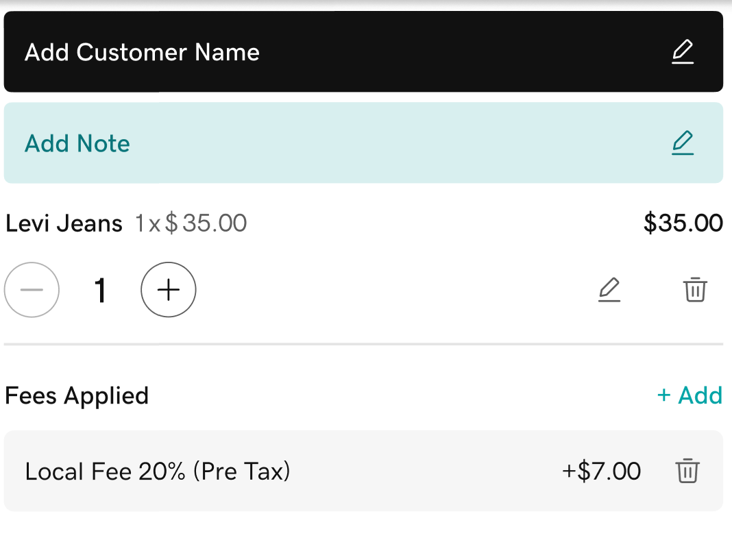 Modifier en regard de l’élément. Touchez + Ajouter à côté de Frais , puis appliquez des frais prédéfinis ou personnalisés . Appuyez deux fois sur Confirmer .