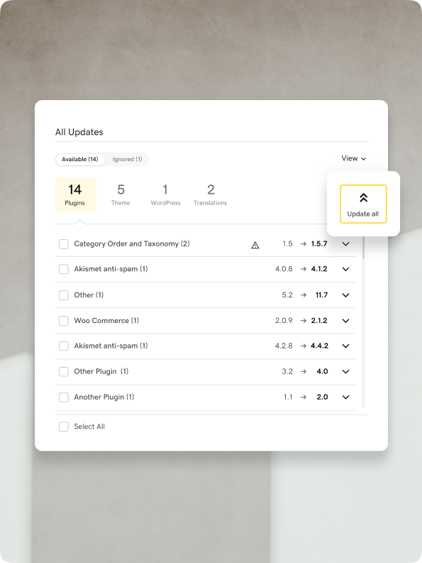 No more manually updating each site and watching your day tick away. With the Hub, schedule bulk updates, plugins and themes for all your sites — no matter where they’re hosted.