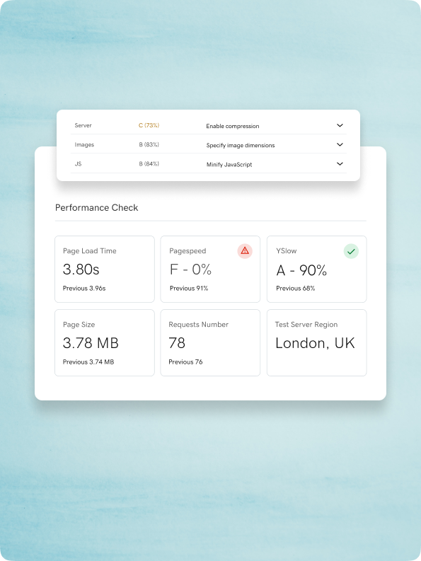 Run performance checks that provide detailed info on load times and component activity, as well as recommendations for improvements.