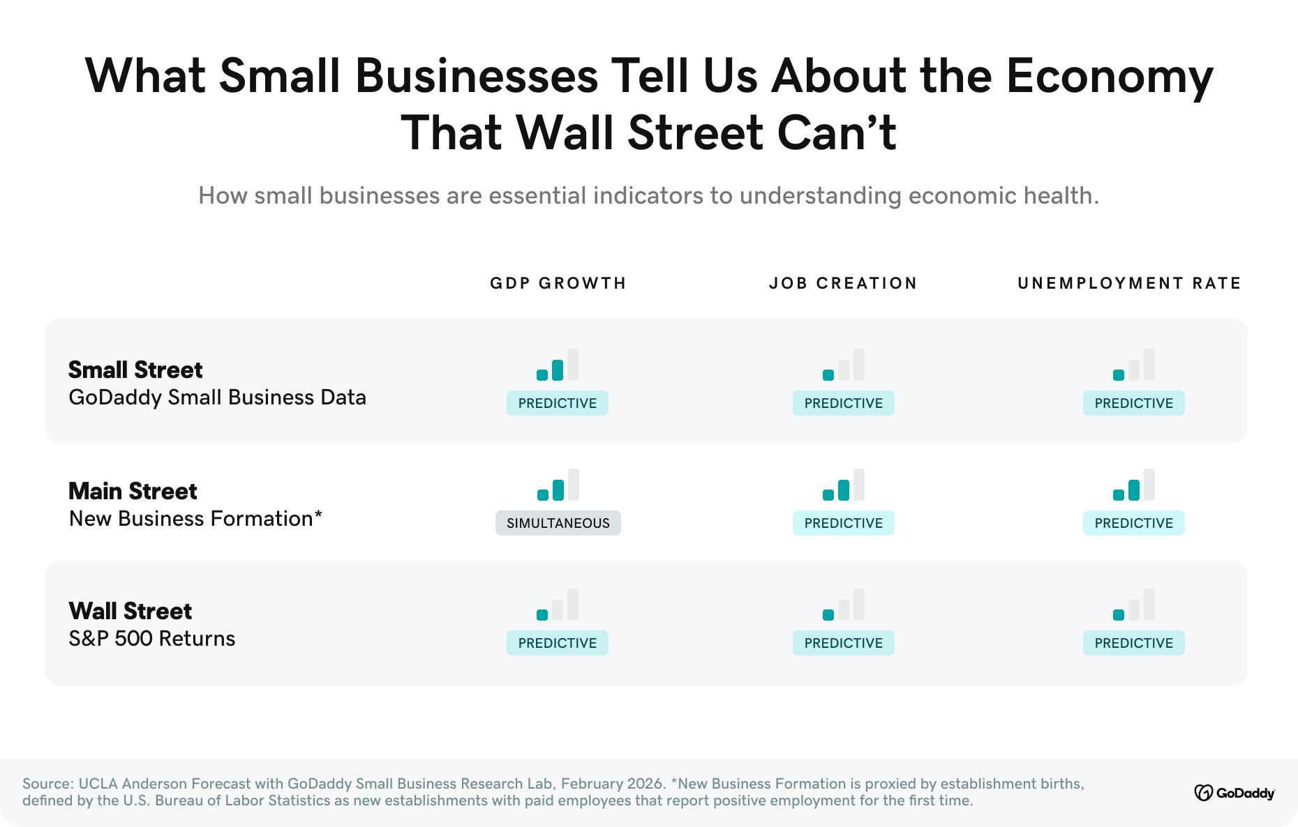 New research from GoDaddy and UCLA Anderson Forecast finds that small business data can offer earlier, and in some cases stronger, signals of U.S. economic performance than traditional measures such as the stock market.