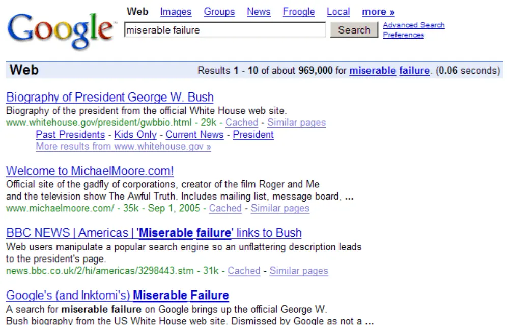I mean, people were able to use a technique called Google bombing to rank informational pages about George W. Bush for the keyword, ‘miserable failure’.