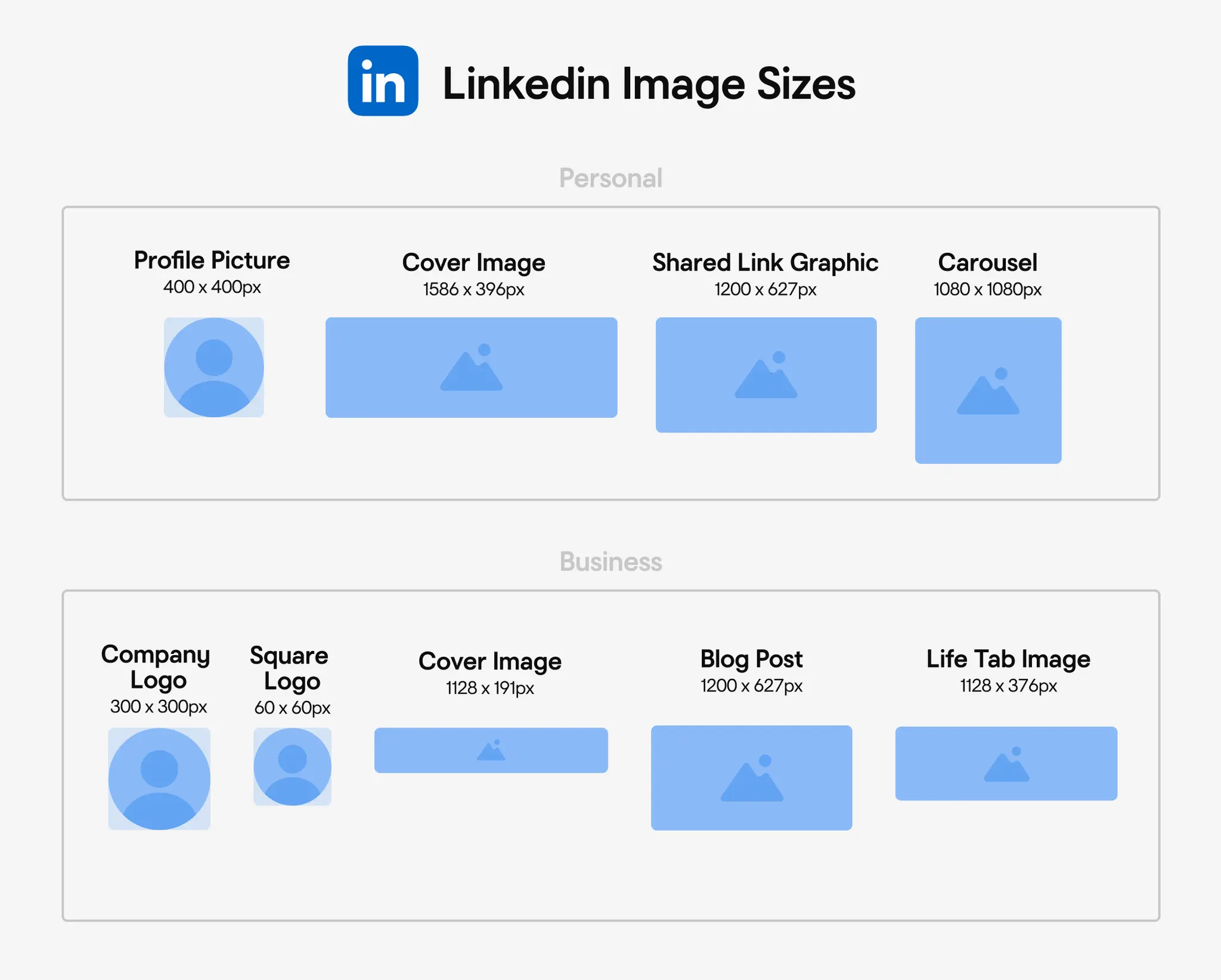 LinkedIn profile picture | 400px x 400px 300px x 300px (company logo) 60px x 60px (square logo) |