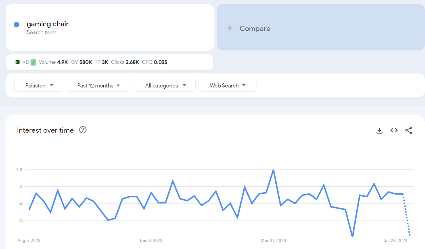 With the help of Google Trends and Google Keyword Planner, we were able to get a pretty clear look at what the trending products are in Pakistan to sell this year based on YoY growth and search volume from May 2023 to May 2024. We also took a look at the interest over time for the past five years which you can view in the Google Trends graphs below.