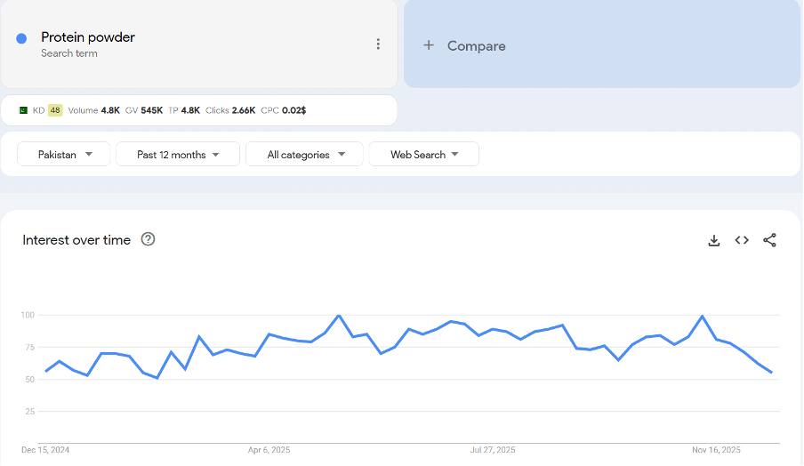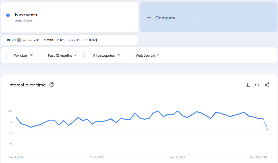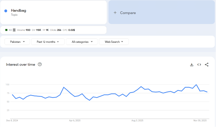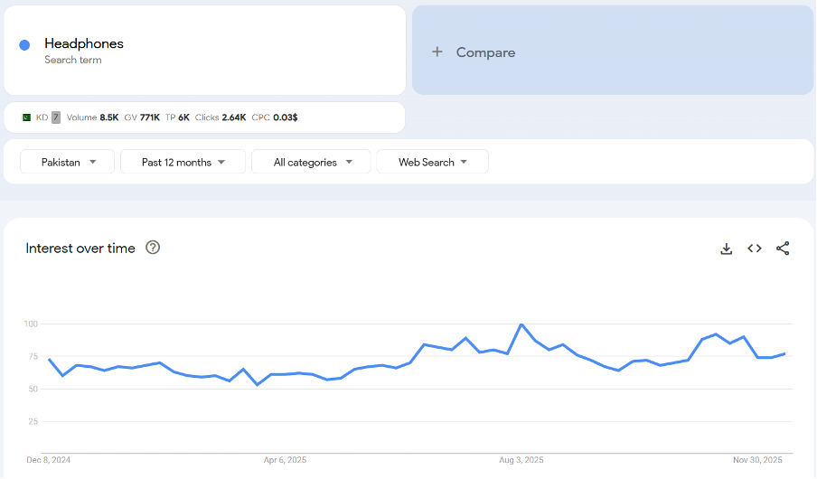 With the help of Google Trends and Google Keyword Planner, we were able to get a pretty clear look at what the trending products are in Pakistan to sell this year based on YoY growth and search volume from November 2024 to November 2025. We also took a look at the interest over time for the past five years which you can view in the Google Trends graphs below.