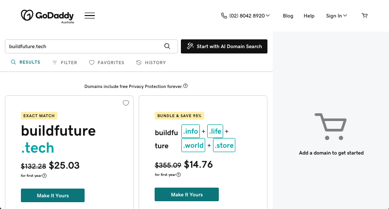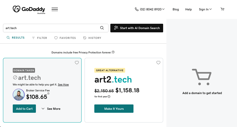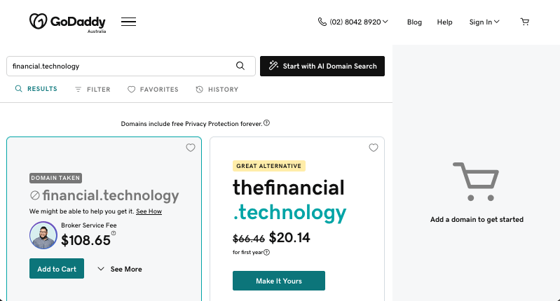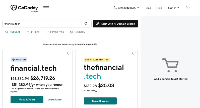Let's assume you were to start a financial tech business called Financial Technology. You begin your domain name search on GoDaddy only to find the .com version of your preferred domain name comes with a premium price tag.
