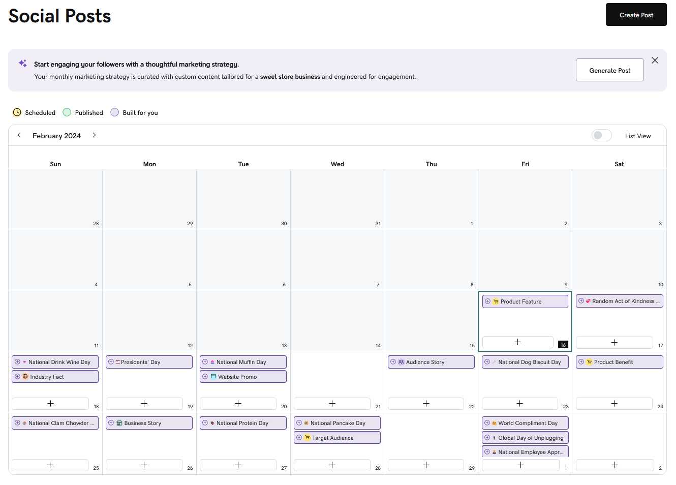 Social media marketing calendar available with GoDaddy Airo, some features will require paid subscription.