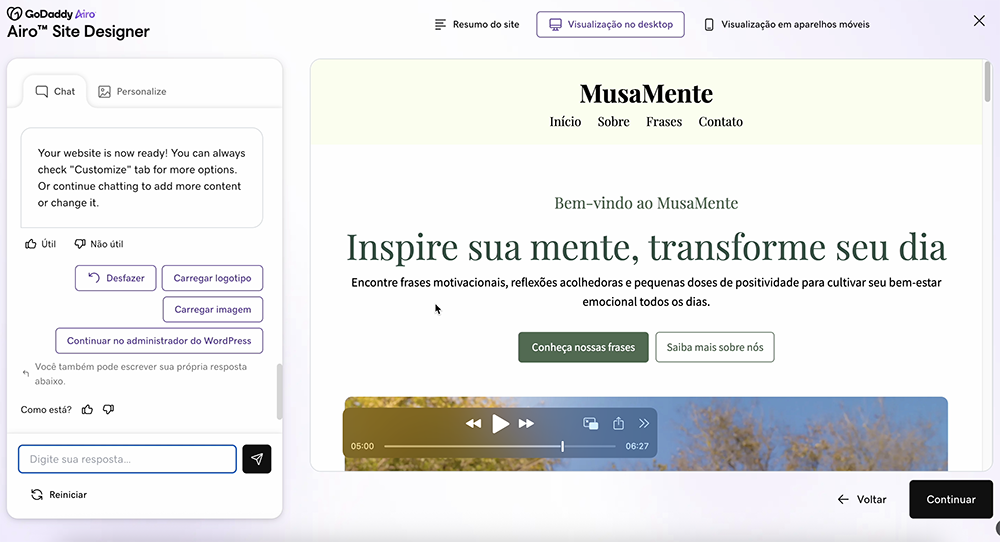 - Refine de forma prática: durante a configuração inicial, basta conversar com o Airo para trocar imagens, editar textos, adicionar páginas ou ajustar o design. As atualizações acontecem na hora;