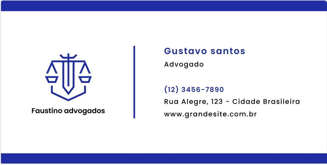 Neste exemplo de um escritório de advocacia, do lado esquerdo aparece o logotipo da empresa, enquanto no lado direito estão os dados personalizados do advogado, o que confere um caráter mais humanizado à comunicação.