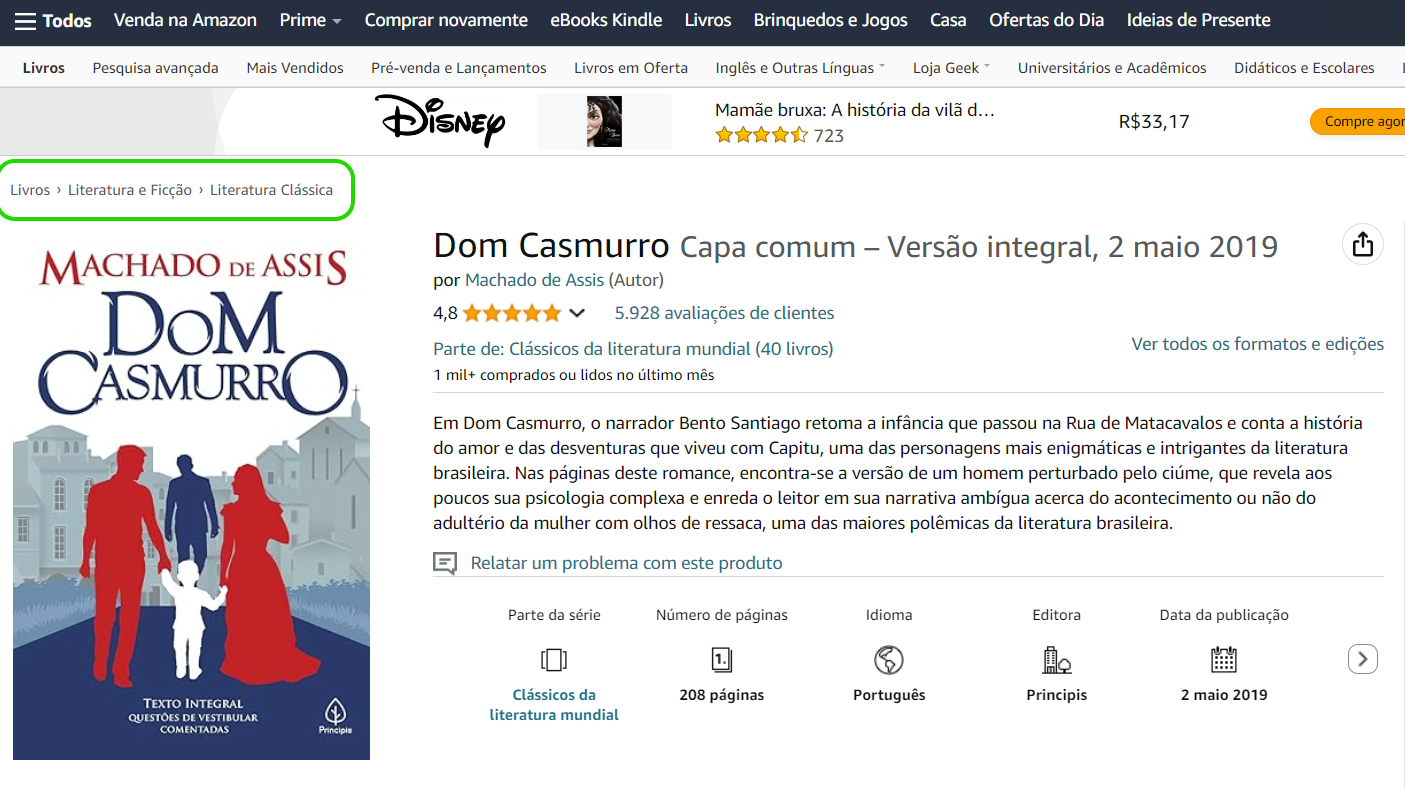 Veja um exemplo de breadcrumbs na página do livro Dom Casmurro, no e-commerce da Amazon. Sinalizamos esse elemento com um contorno verde: