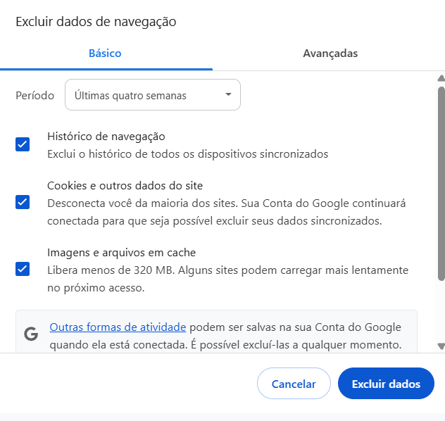 - Na aba “Básico”, marque a opção “Imagens e arquivos armazenados em cache”; você também pode definir o intervalo de tempo (última hora, últimas 24h, últimos 7 dias ou todo o período).