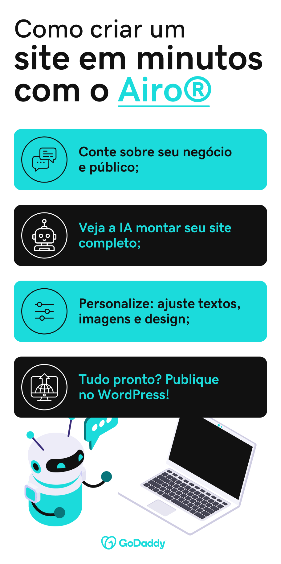 O Airo® da GoDaddy é uma ferramenta que combina a velocidade do ChatGPT com a robustez do WordPress, o que permite criar sites completos em minutos.