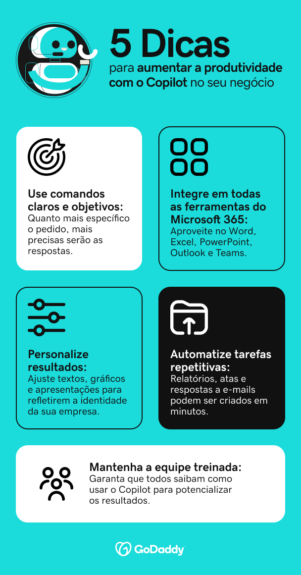 Para utilizar o Copilot em escala empresarial, é necessário adquirir a licença Copilot, contratada separadamente ou junto aos Copilot planos oferecidos pela Microsoft 365 via GoDaddy.