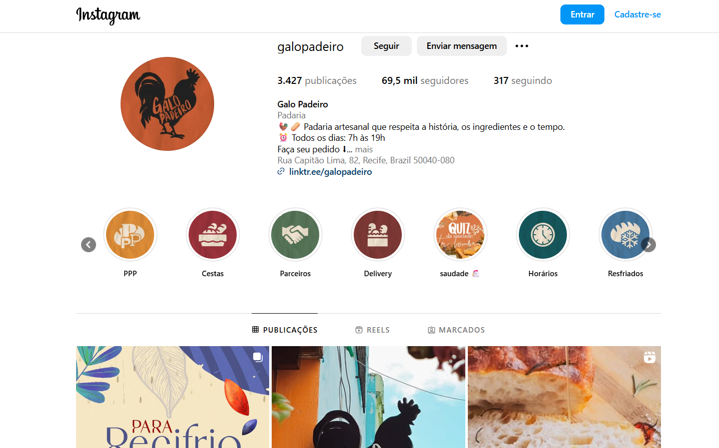 Crie destaques organizados ou use o feed como vitrine. Imagens bem produzidas, legendas completas e um link na bio ajudam muito. Quer um exemplo? O perfil da Galo Padeiro (@galopadeiro), uma padaria artesanal de Recife (PE), mantém um catálogo visual super bem estruturado no Instagram: