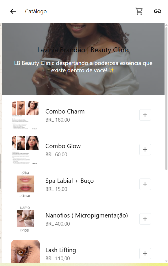 Um exemplo de catálogo pelo WhatsApp é o da Lavínia Brandão | LB Beauty Clinic, designer de sobrancelhas de Caruaru (PE). Ela utiliza o recurso para organizar seus procedimentos de forma prática: