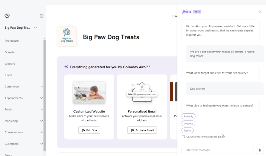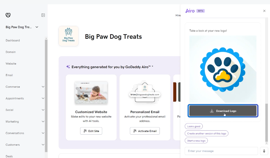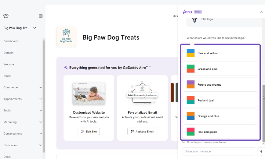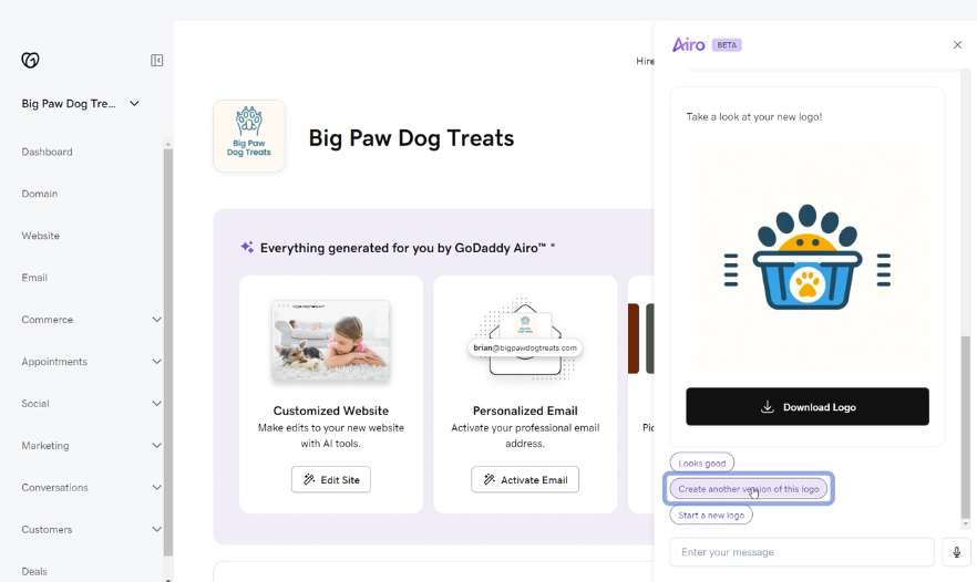 A IA do GoDaddy Airo irá ajustar o design conforme suas instruções adicionais para oferecer novas opções.