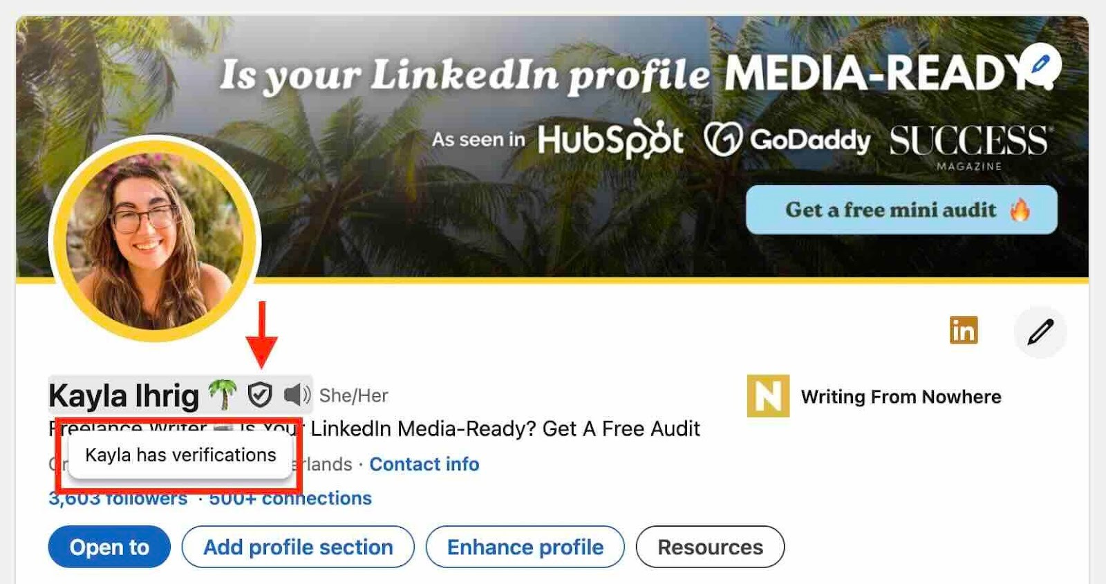 Verificações de perfil existem para construir confiança entre usuários no LinkedIn. Os usuários podem verificar sua identidade por meio de um e-mail de trabalho, e-mail educacional ou ID emitido pelo governo. Se verificado com sucesso, seu perfil receberá um selo de marca de seleção.
