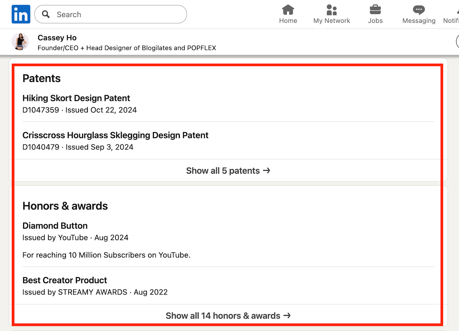 No perfil da designer Cassey Ho, por exemplo, patentes e prêmios reforçam reconhecimento e especialização.