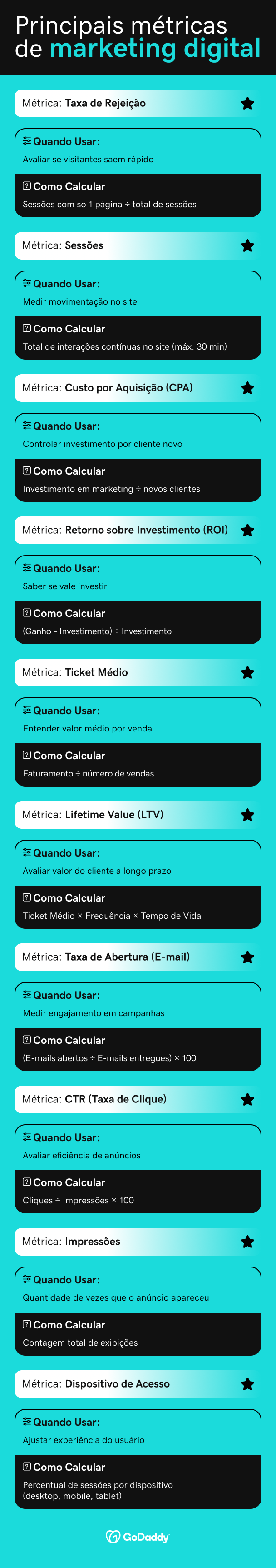 São as medidas brutas que mostram dados quantitativos do seu negócio, como cliques, tempo de navegação e taxa de rejeição. Esses indicadores representam informações que você coleta para entender o que acontece com o seu empreendimento digital.