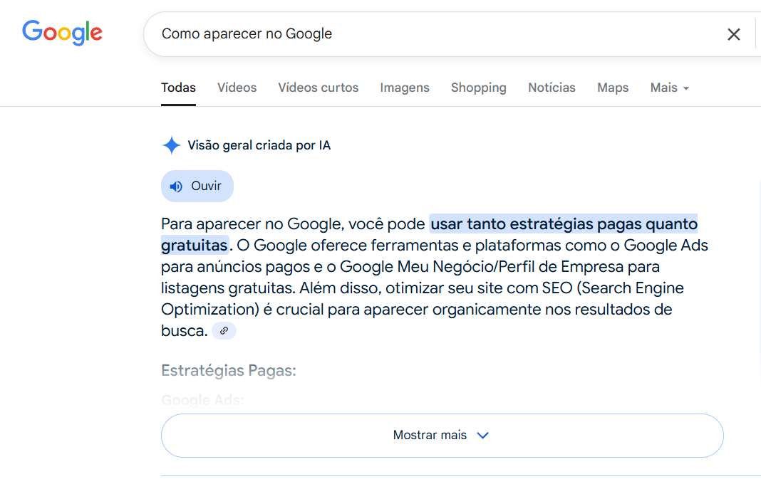 Hoje, esse buscador não exibe só uma lista tradicional de links nos resultados de busca. O Google também tem incorporado “Visões Gerais criadas por IA” (AI Overviews), resumos que aparecem no topo da página de resultados.