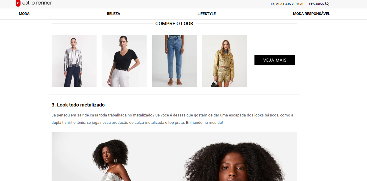Quer dizer, pense novamente no blog da Renner, que traz sugestões de look acompanhadas de imagens reais das peças disponíveis na loja e links para comprar diretamente cada item.