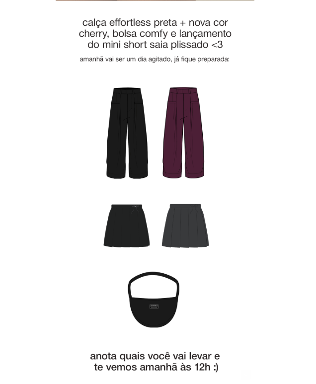 O e-commerce de moda Lela Brandão é craque em e-mails promocionais. Por exemplo, a marca costuma fazer live no dia de lançamento de novas coleções e lança e-mails promocionais de expectativas, como esse: