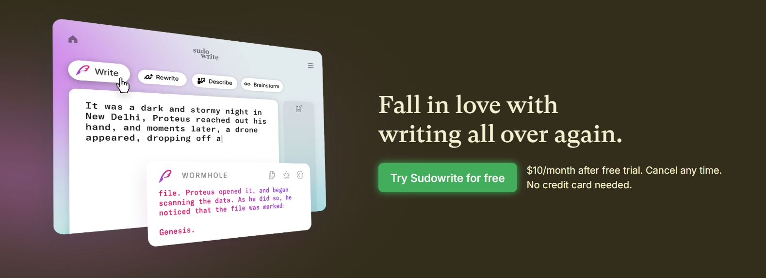 A chamada no final da página, “Fall in love with writing all over again” (Apaixone-se pela escrita novamente), acompanha um botão verde bem visível com o CTA “Try Sudowrite for free” (Experimente o Sudowrite gratuitamente).