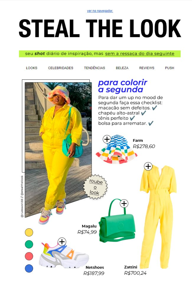 Exemplo criativo: observe o e-mail marketing abaixo. O CTA desta campanha é "Roube o look". O texto foge do tradicional e traz um tom descontraído, jovem e moderno, que se conecta diretamente com o público da marca. Além de ser divertido, o convite desperta curiosidade e cria senso de exclusividade.