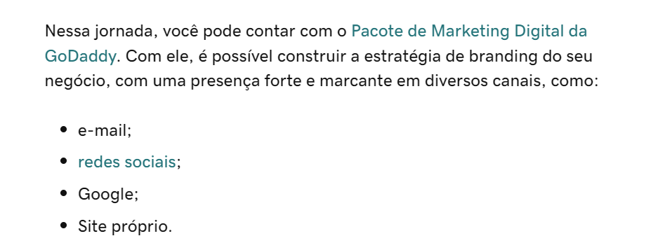 Exemplo prático: neste artigo da GoDaddy, o CTA para o Pacote de Marketing Digital aparece como parte do corpo do texto e conduz o leitor à solução sem quebrar o ritmo da leitura. Essa técnica funciona bem em blogs, materiais ricos e até FAQs, pois aproveita a jornada de descoberta do usuário.
