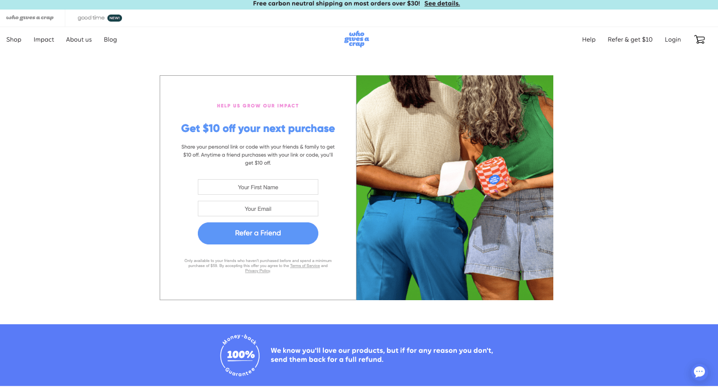 Additionally, they have a special "Refer a Friend" page where you can earn a discount whenever a friend makes a purchase using your unique link or code. This is a fantastic way to spread awareness about their social impact and encourage others to join the cause.