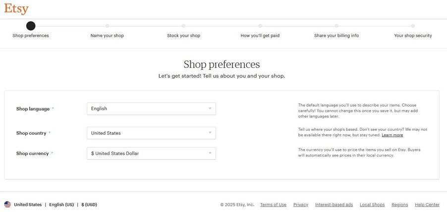 After that, you can set your shop preferences, including your shop language, the country where your shop is based, and the currency that you’ll use to price your products. Customers will always see your products in their local currency.