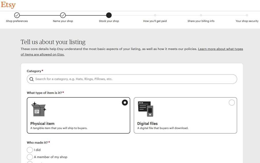 To begin, you’ll need to accept the Etsy shop agreement, then proceed to answer a few starter questions about your store.