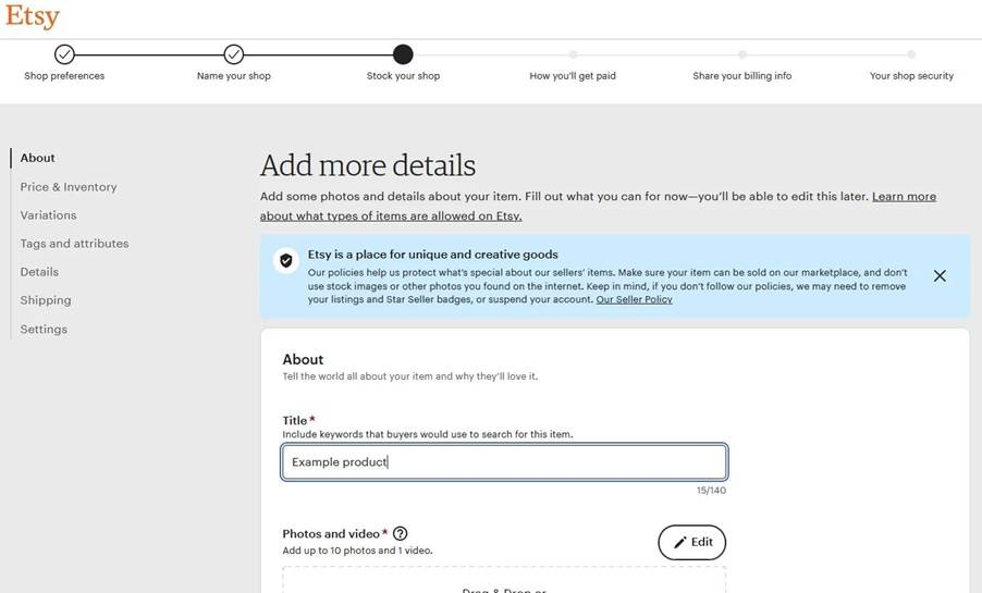 In the listing details, you can add your product’s name, category, description, and other high-level information.