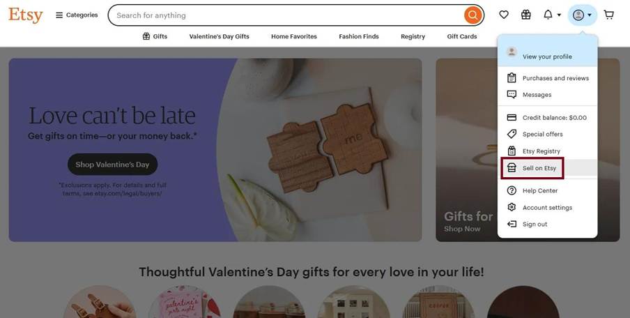 You’re now ready to create your Etsy store. Click the user icon in the top right corner and select “Sell with Etsy” to begin the process of setting up your Etsy storefront.