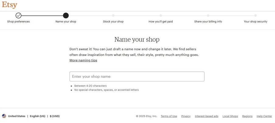 Next, enter the shop name that you chose in the first steps of this process. If you’re still unsure about your store name, consider using GoDaddy’s Business Name Generator to come up with a great store name. You may change your name later from Etsy’s store manager.