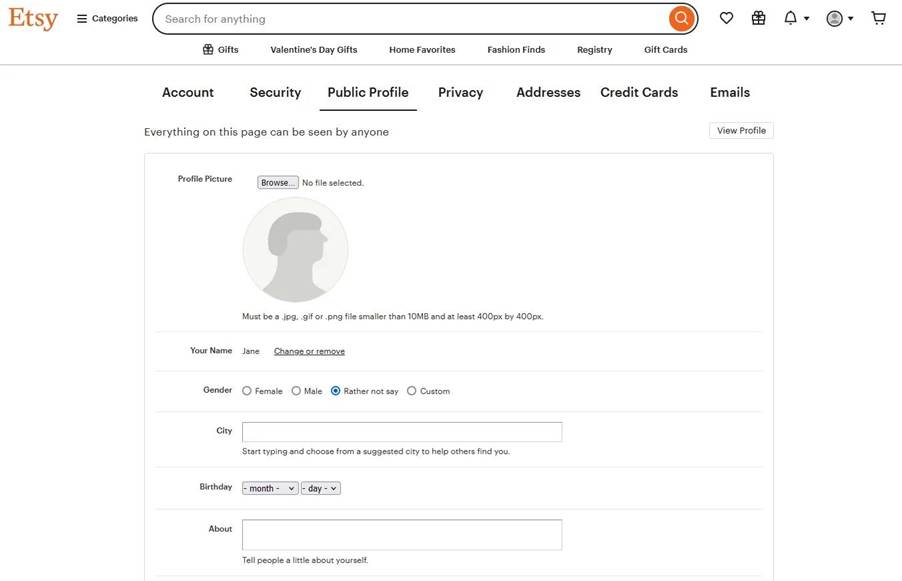 Once you’ve created an account, you can update your personal profile. This will help shoppers learn more about you and the materials you use in your products. To update your profile, select the user icon in the top right corner and click “View your profile,” then click ‘Edit public profile’ on the next page.