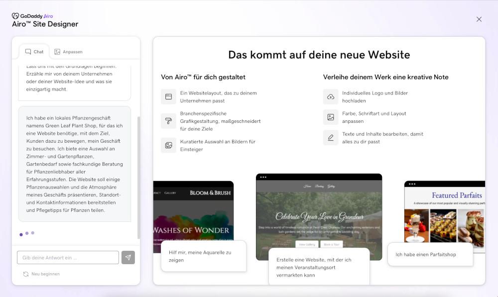 Mit den meisten KI-Website-Buildern kannst du lediglich einfache Landingpages erstellen. Der Airo Site Designer von GoDaddy geht weiter: