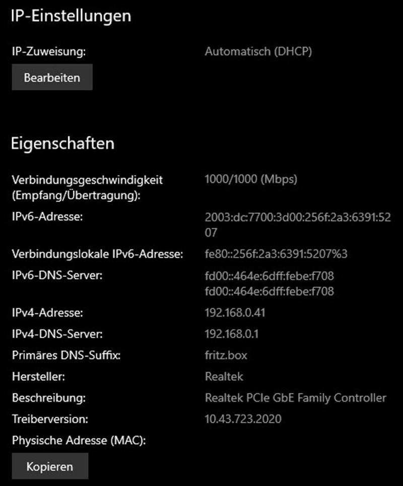 Hier sehen wir, dass der Router, in diesem Fall eine Fritz!Box, IPv4- und IPv6-Adressen an den PC vergeben hat. Diese Zuweisung kommt automatisch, was bei normalen PCs oder Smartphones vollkommen ausreicht.