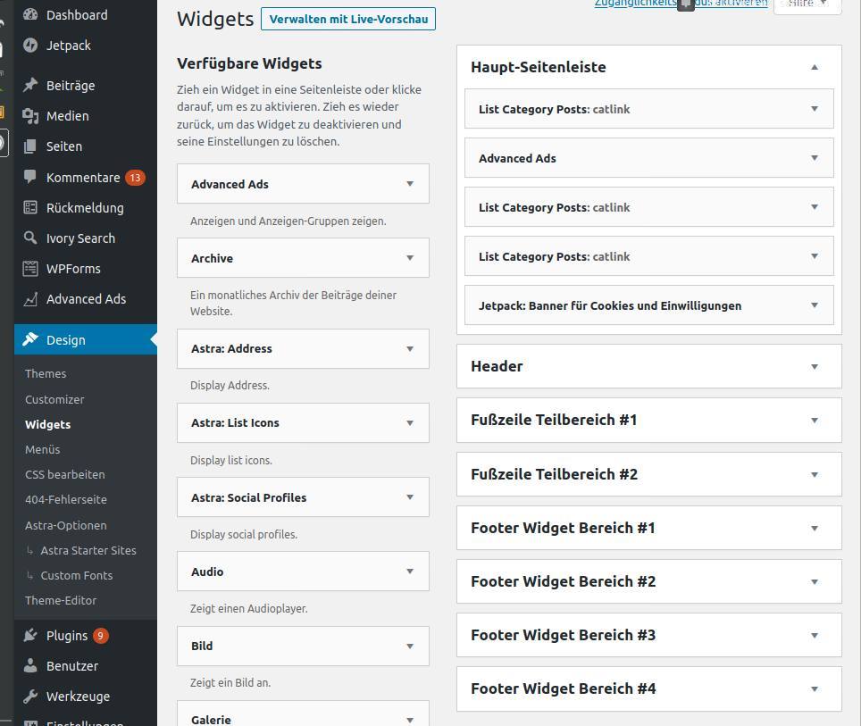 Klicke im Backend auf Design > Widgets. Die angezeigte Auswahl hängt von den aktiven Plugins ab. Hier fügst du wahlweise die Standardsuche von WordPress oder besser ein Widget der Search-Plugins in den Header hinzu. Die Zuweisung erfolgt per Drag-and-drop oder durch das Dropdown-Menü des Widgets. Trage einen Namen ein und speichere die Änderungen ab.