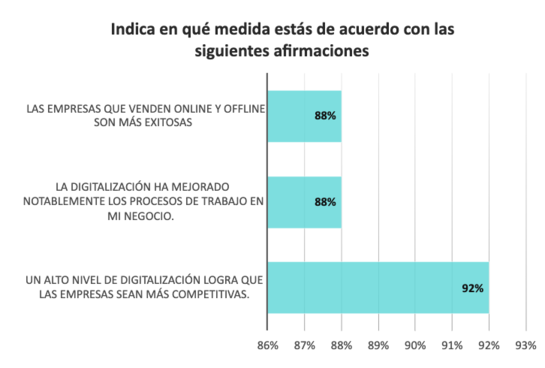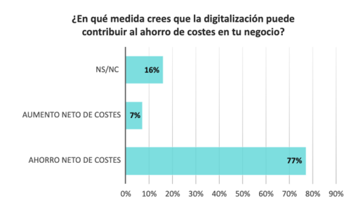 Además, la digitalización también tiene un impacto directo en los costes operativos. Según datos del estudio, tres de cada cuatro empresarios (77%) reconocen que la digitalización ha ayudado a reducir los costes de sus negocios, mientras que solo un pequeño porcentaje (7%) considera que ha aumentado sus gastos.