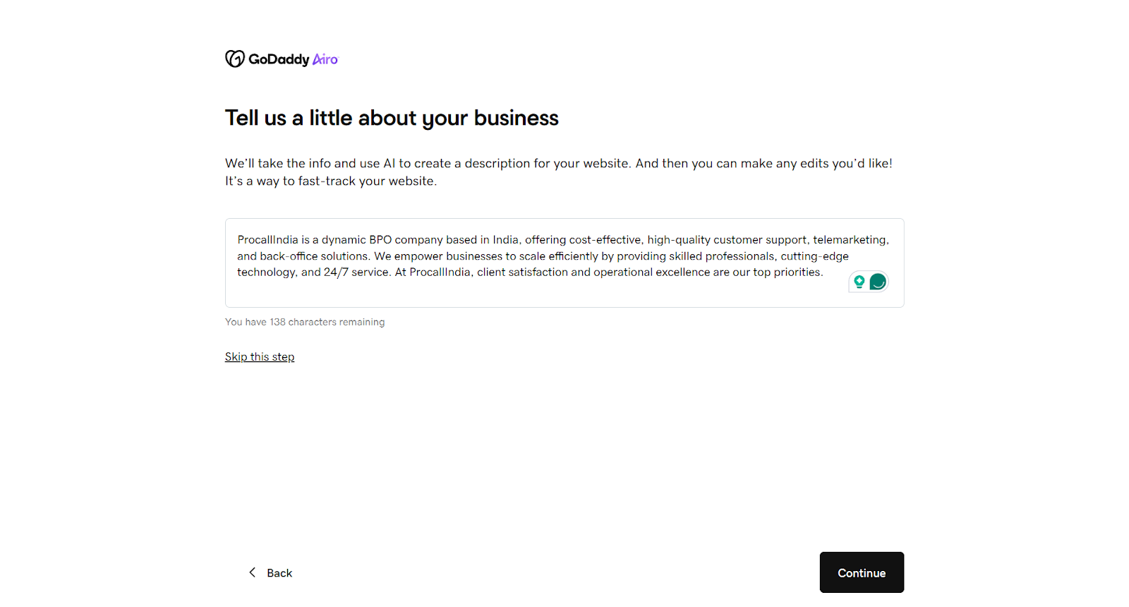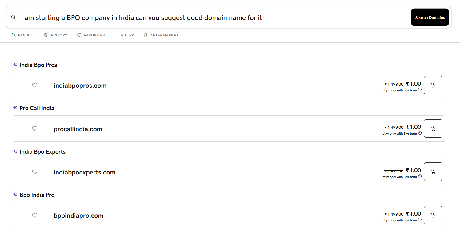 GoDaddy Airo will recommend brandable domain names like procallindia.com if you search for a suitable business term (for example, BPO firm in India).