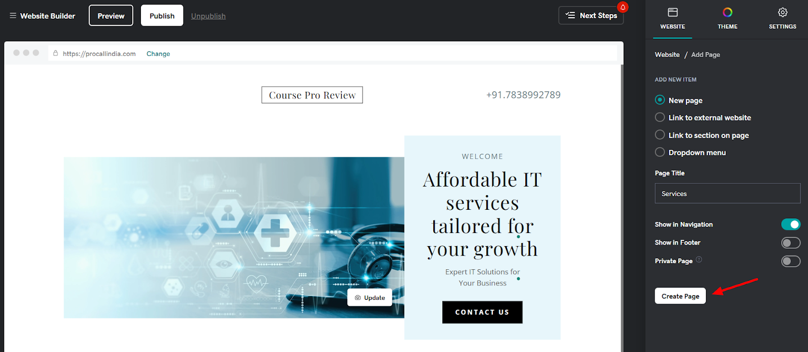 Choose New Page under Website > Add Page, then give it the name "Services." Change the navigation bar's visibility. This enables you to highlight services like back-office assistance, telemarketing, and BPO.