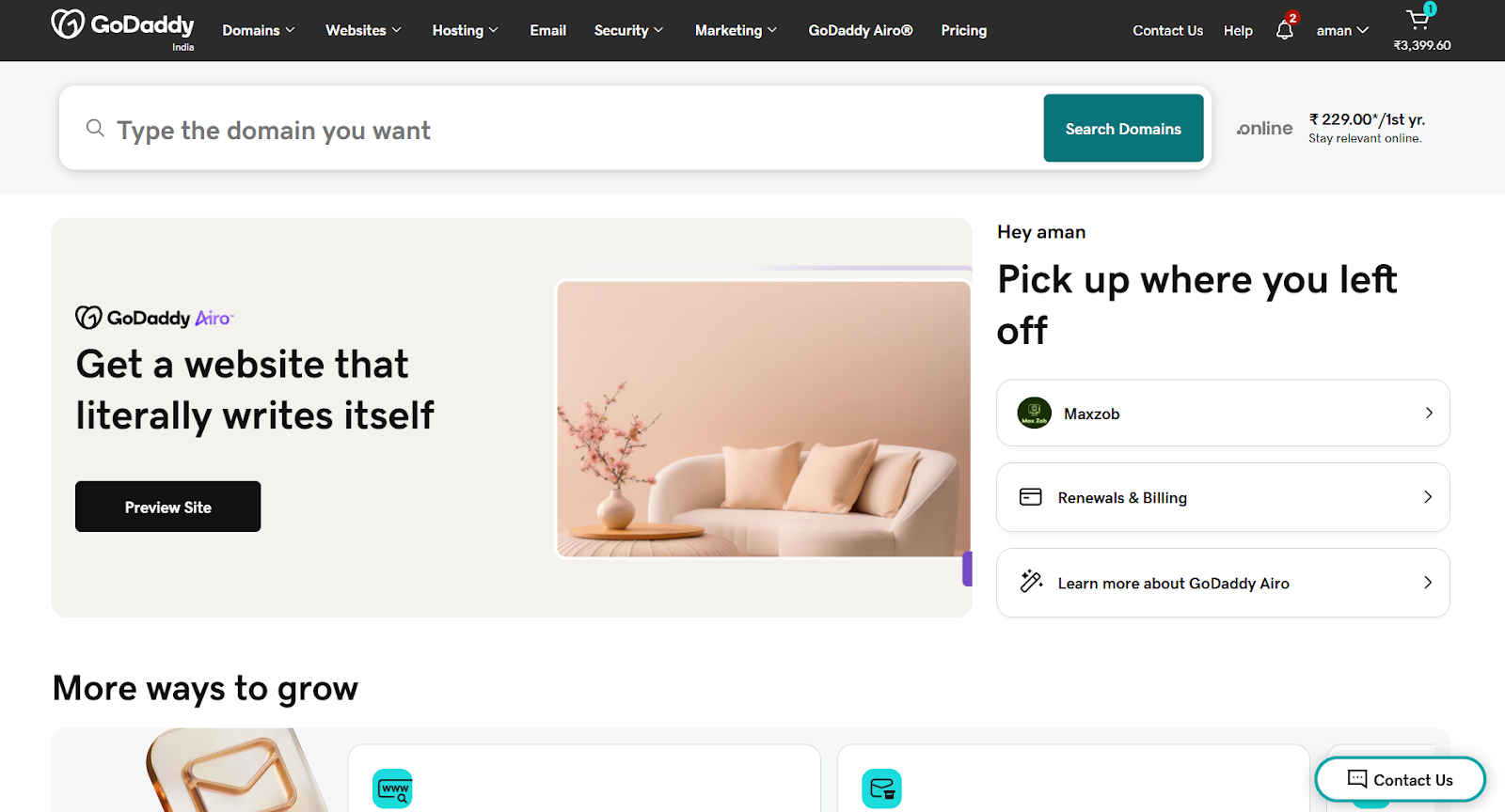 In addition, GoDaddy Airo, an integrated AI-powered solution, simplifies the process of getting online for GoDaddy customers. Additional services, such as hosting, email, and web design and marketing solutions, are also available.
