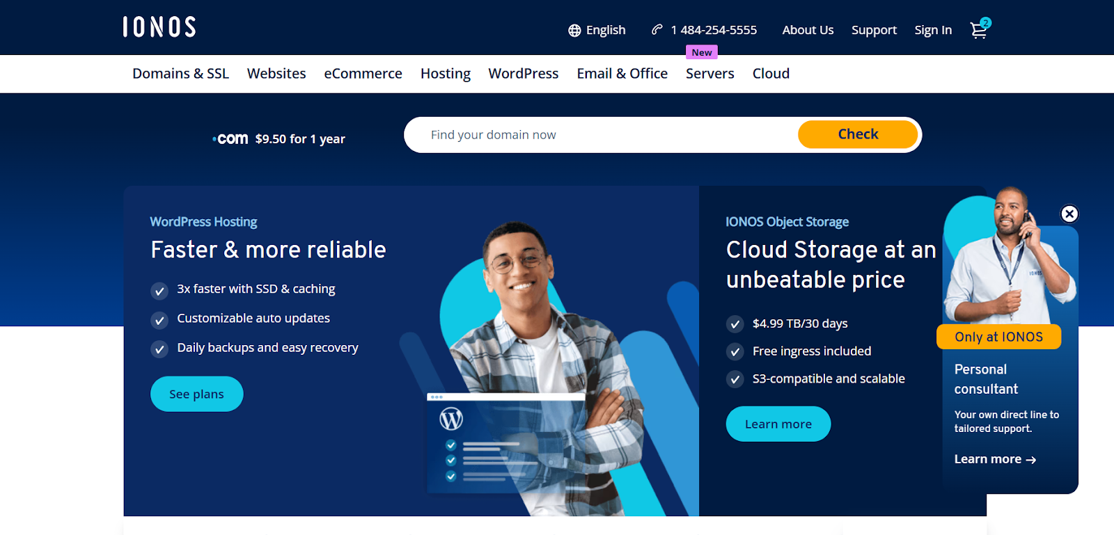 - Additional services: A free SSL certificate email account is included with domain purchases. IONOS also offers hosting, ecommerce and site builder services, along with 24/7 customer support, including telephone support.