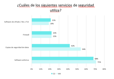 Según los datos de la encuesta, solo el 22% de los emprendedores utiliza firewalls y apenas el 19% emplea software de encriptación, lo cual deja expuestos a muchos negocios a potenciales ataques cibernéticos.