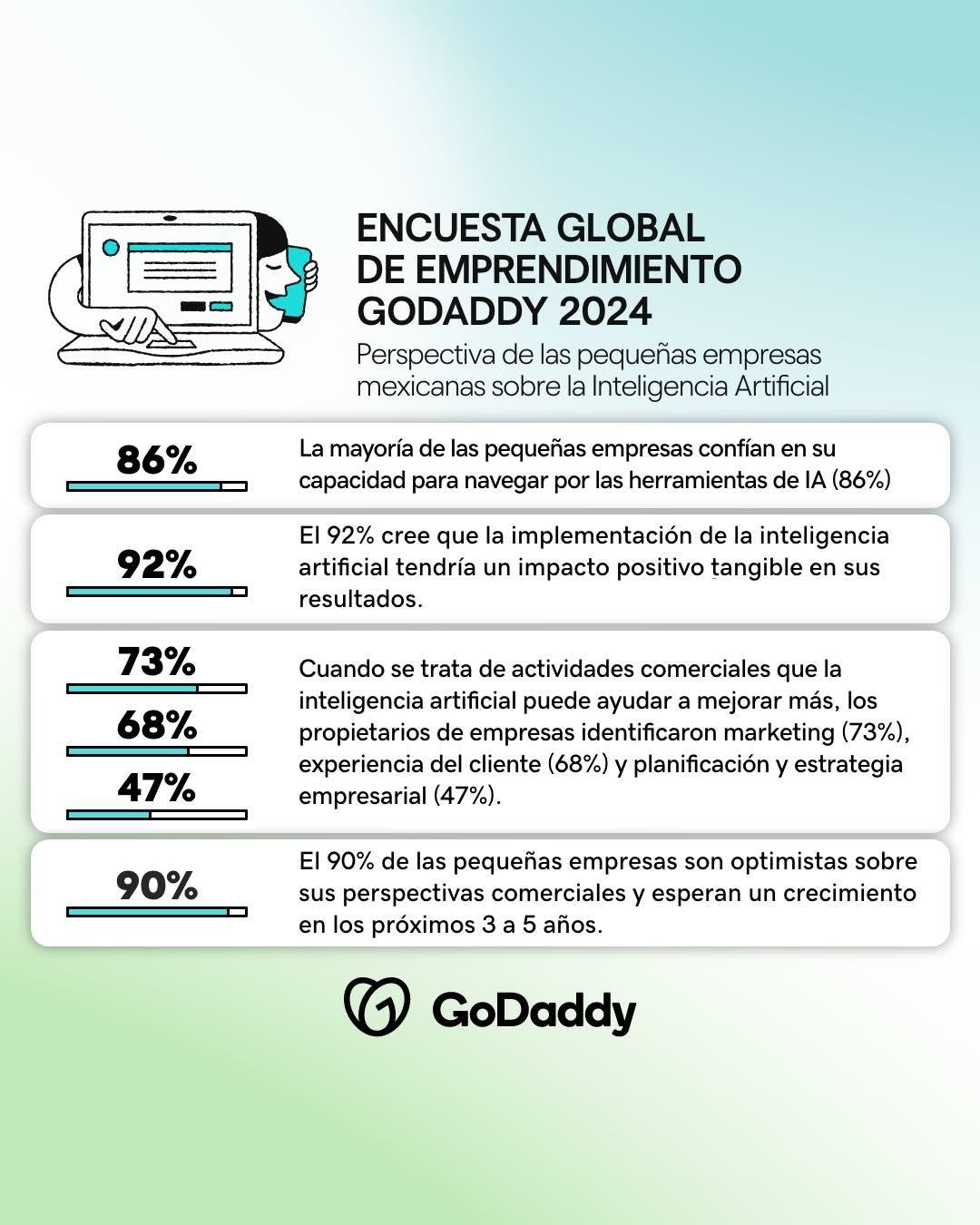 La segunda oleada de la Encuesta Global de Emprendimiento de GoDaddy México 2024, centrado en el uso de la IA por parte de las pequeñas empresas, pone de manifiesto que los emprendedores mexicanos están adoptando activamente la IA y define qué papel están jugando estas tecnologías en la transformación y expansión de sus negocios.