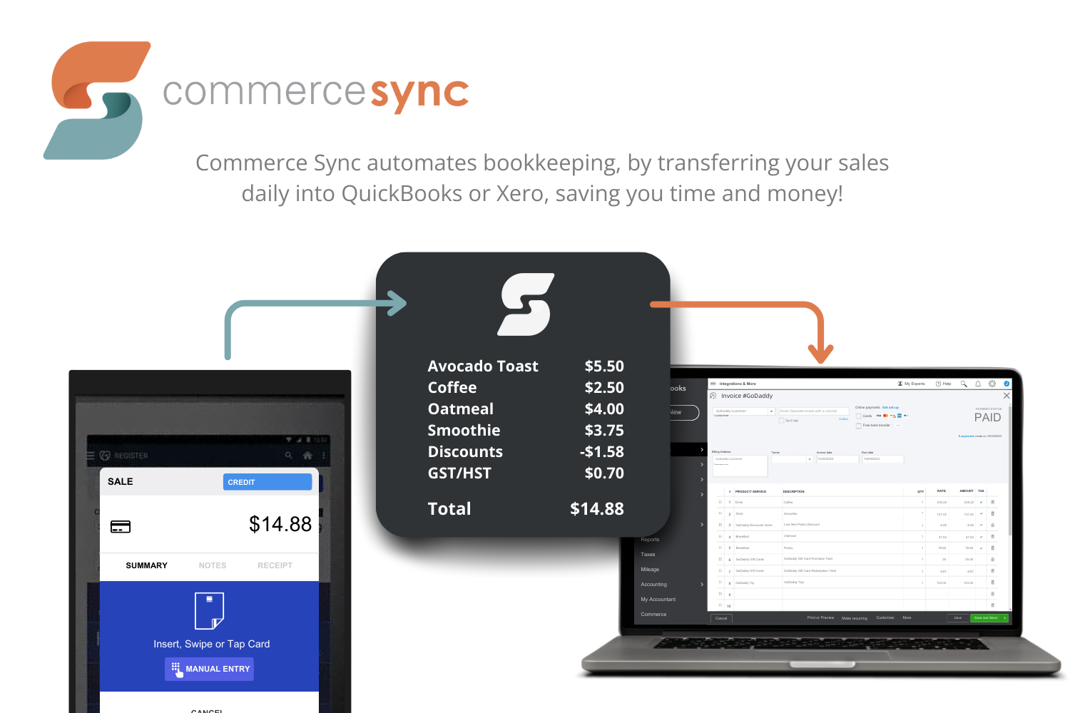Commerce Sync automates the transfer of GoDaddy activity into QuickBooks Online, QuickBooks Desktop and Xero. This saves valuable time so you can focus on what you do best — running your business. The setup is simple — just connect GoDaddy / Poynt to QuickBooks or Xero. Your sales activity will start transferring automatically the very next day. This includes your taxable and non-taxable sales, discounts, refunds, and more.