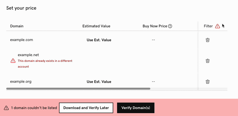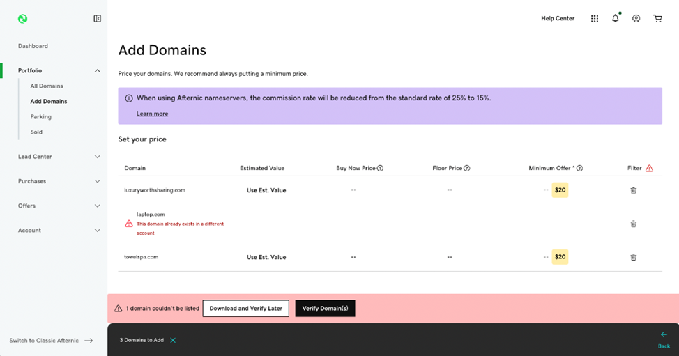 If any domain names you’re attempting to add to your account are already listed at Afternic, the system will alert you with a prompt to verify ownership.