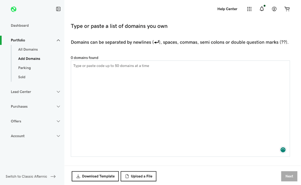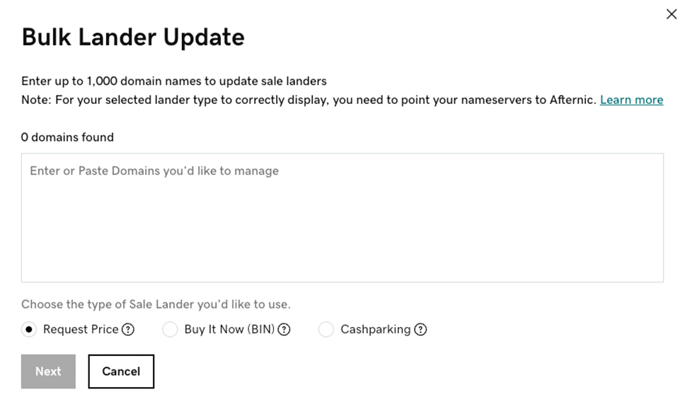 Using the “Bulk Lander Update” button from the Afternic Portfolio Dashboard, you’ll be presented with a pop-up allowing you to paste up to 1,000 domain names. From here, you can quickly change the landing page for the pasted list of domain names.